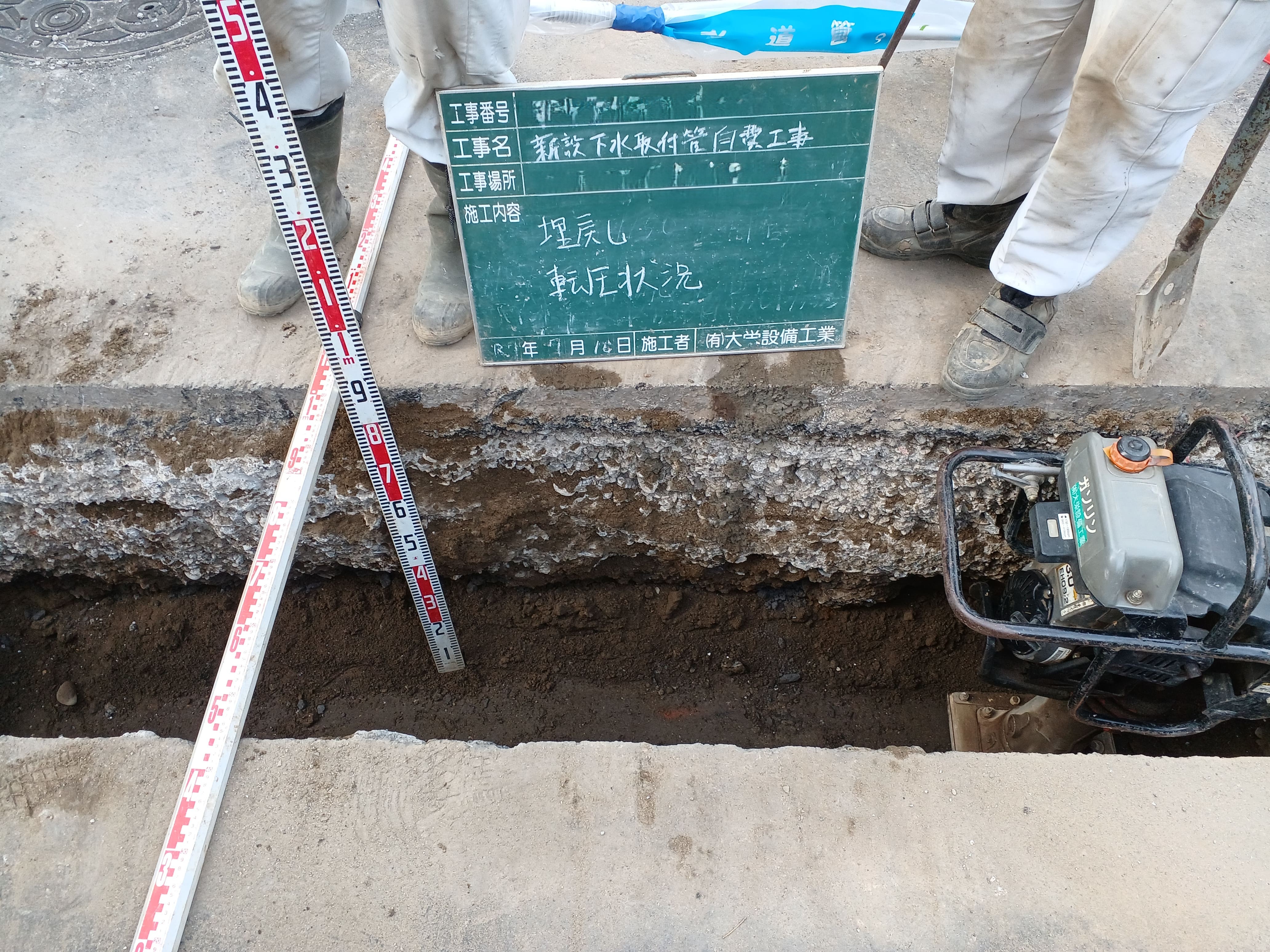 埋戻しおよび転圧作業まで丁寧に行い、将来的な沈下や漏水のないよう確実な仕上がりといたしました。